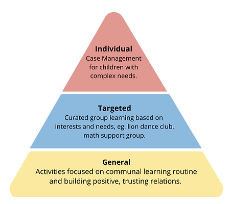Not just a drop-in centre, Tak Takut Kids Club (TTKC) provides tailored support to the children in the community, who have varying strengths, needs, and challenges. Using the Response-To-Intervention (RTI) model (see left), we provide targeted interventions to those requiring additional assistance, ensuring that every child can flourish and not fall through the cracks.